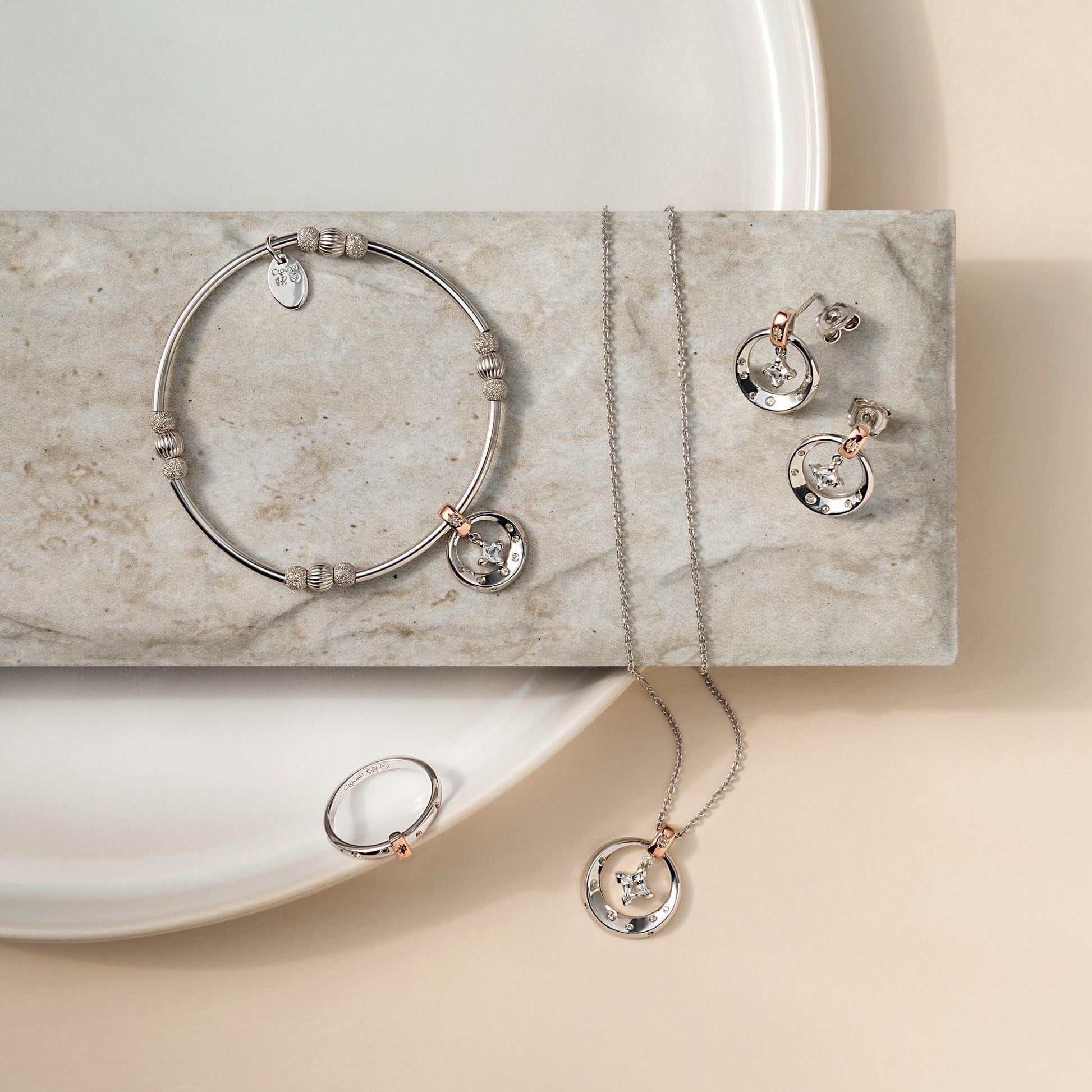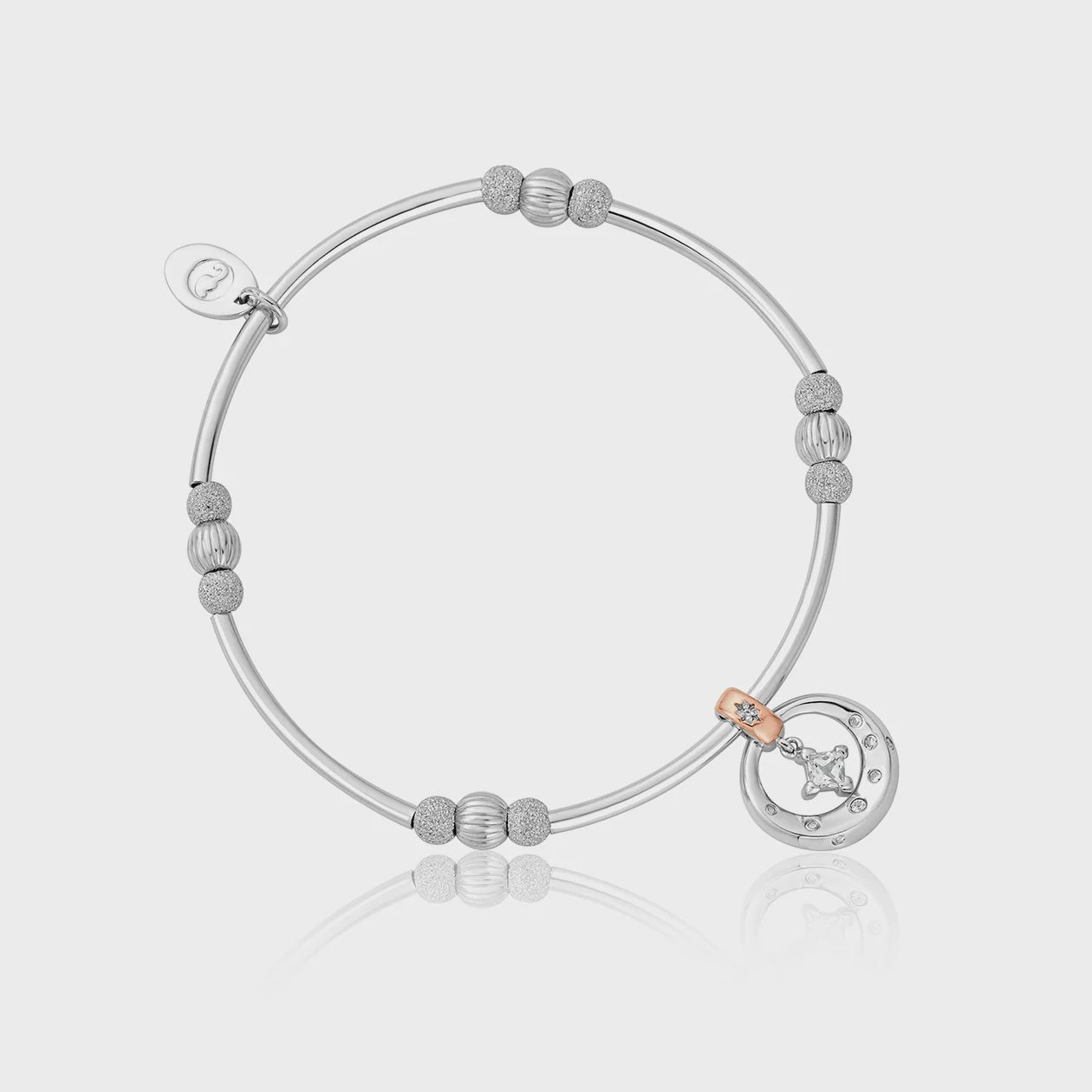 Stars of the Llyn Peninsula White Topaz Affinity Bead Bracelet. As night falls in the Llyn Peninsula, stargazers are awed by celestial beauty. Inspired by the Welsh skies that provide this spectacular light show, this sterling silver and 9ct rose gold bracelet containing rare Welsh gold features a free hanging 13mm motif set with dazzling genuine faceted white topaz.