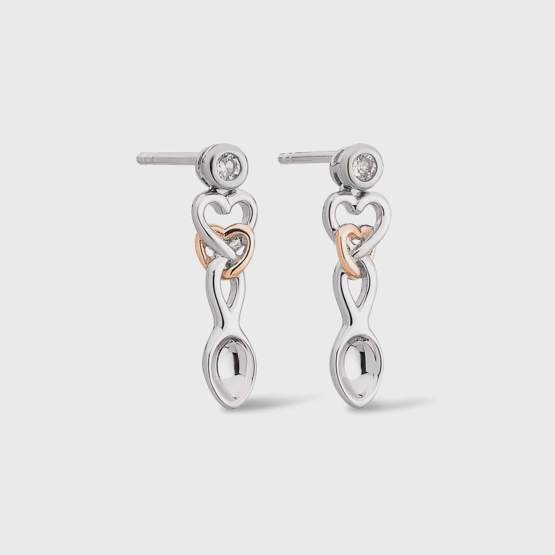 Dating back to the 17th Century, amorous young Welsh folk would carve a spoon from wood, decorate the handle with romantic symbols, and gift it to the one they adored. We’ve carefully fashioned our Lovespoons Silver Earrings from interlocking hearts of sterling silver and 9ct rose gold. A white topaz gemstone at the top adds a spoonful of sparkle.