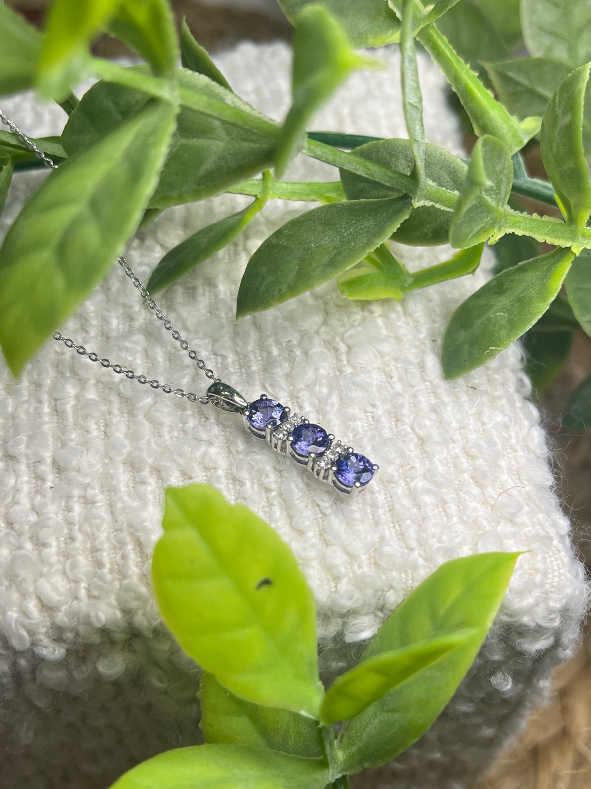 A stunning baguette pendant with three round cut Tanzanite’s stones, complimented by smaller white diamonds. Set in 9ct white gold and thread on a fine white gold chain, this is a really striking piece