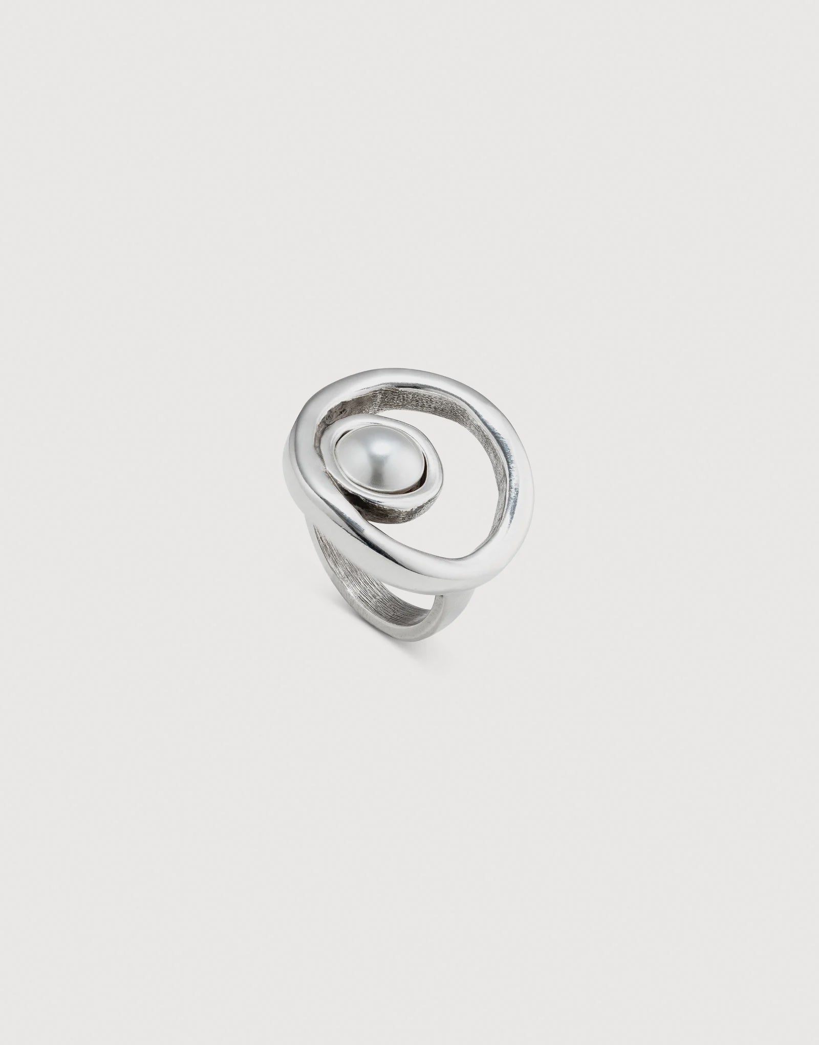 Sterling silver-plated ring, with an irregular design and a pearl crystal in the center. 100% handmade in Spain by UNOde50.