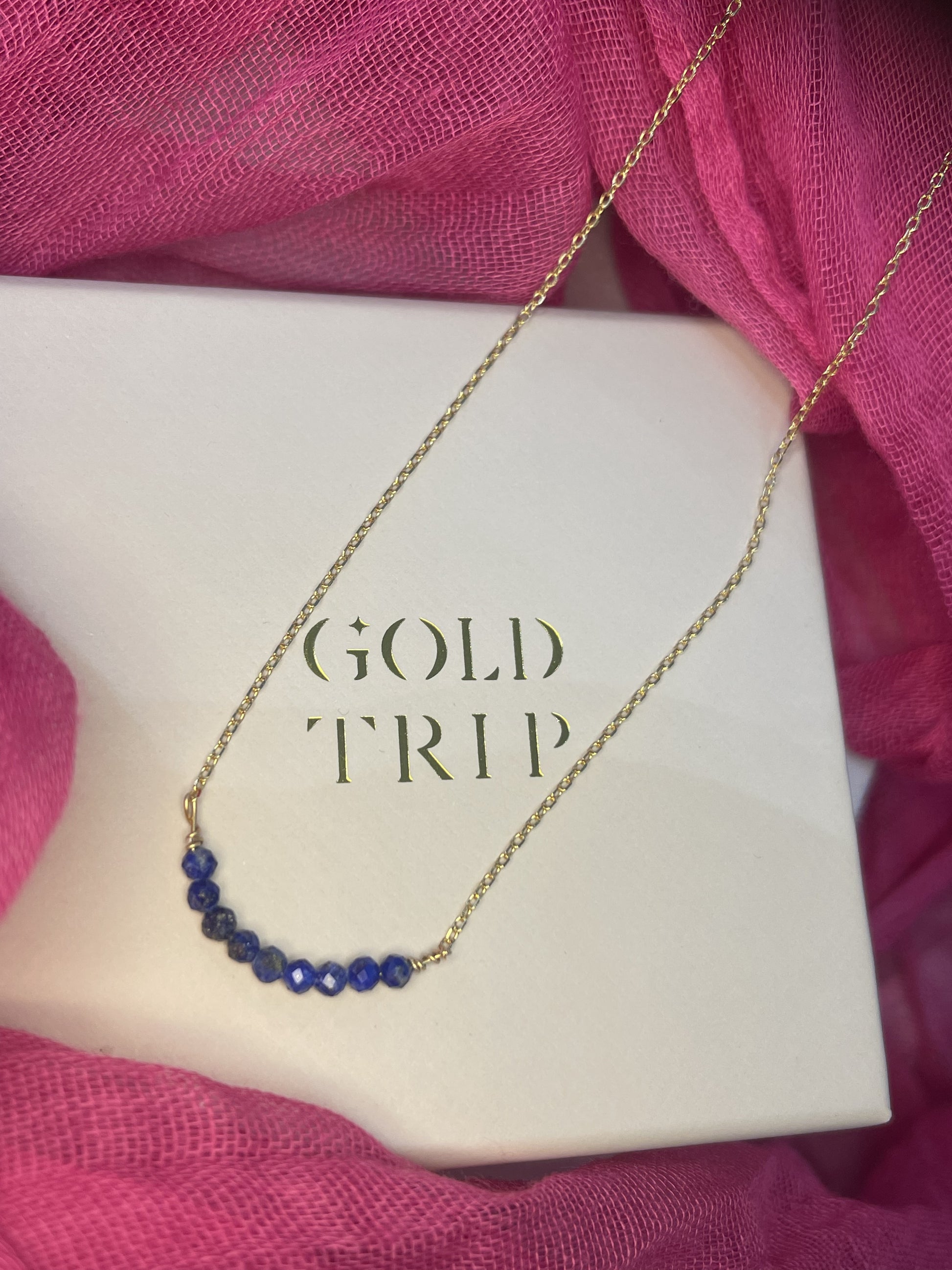 The lapis lazuli stones are faceted for extra sparkle and carefully hand-strung onto a fine link chain. The overall necklace length is adjustable via an extension chain and the chain is fastened via a lobster clasp. Gold Trip logo engraved disc and hallmark feature at the end.