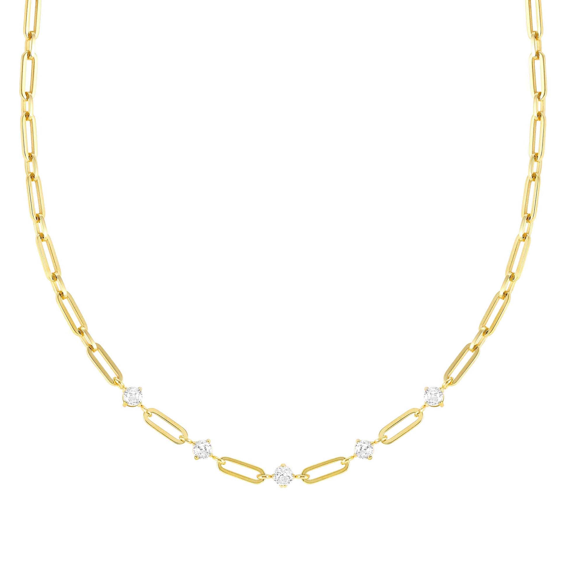 Stainless steel necklace with white Cubic Zirconia, available also with yellow PVD colour coated finish. Length: 46 cm. Made in PRC. This is a versatile necklace, perfect for every occasion.