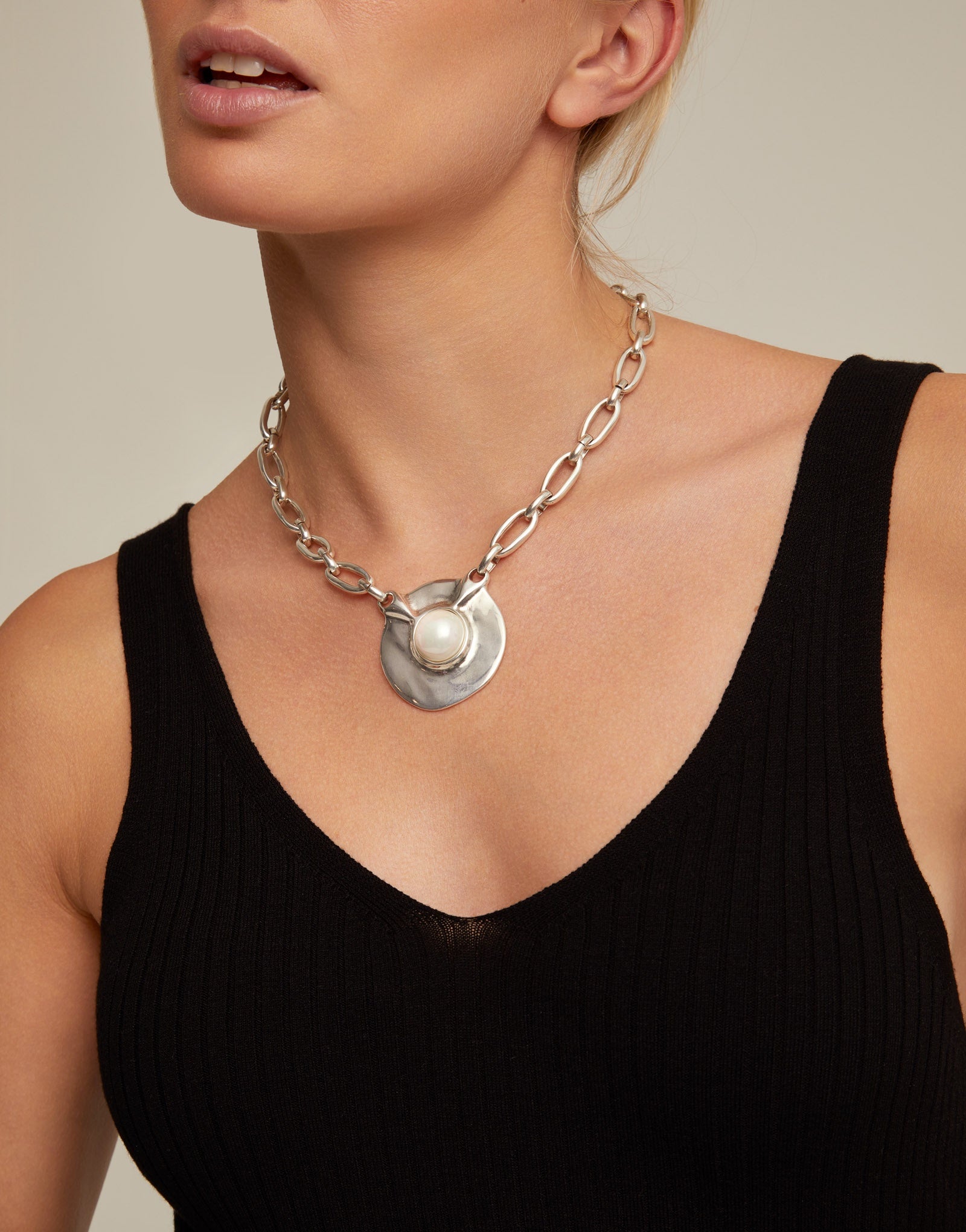 Short necklace featuring large links and a large central piece set with a pearl. It features a lobster clasp, allowing you to adjust this piece of jewelry to the desired length. This one-of-a-kind necklace is handmade in Spain from silver-plated metal using entirely artisan techniques.