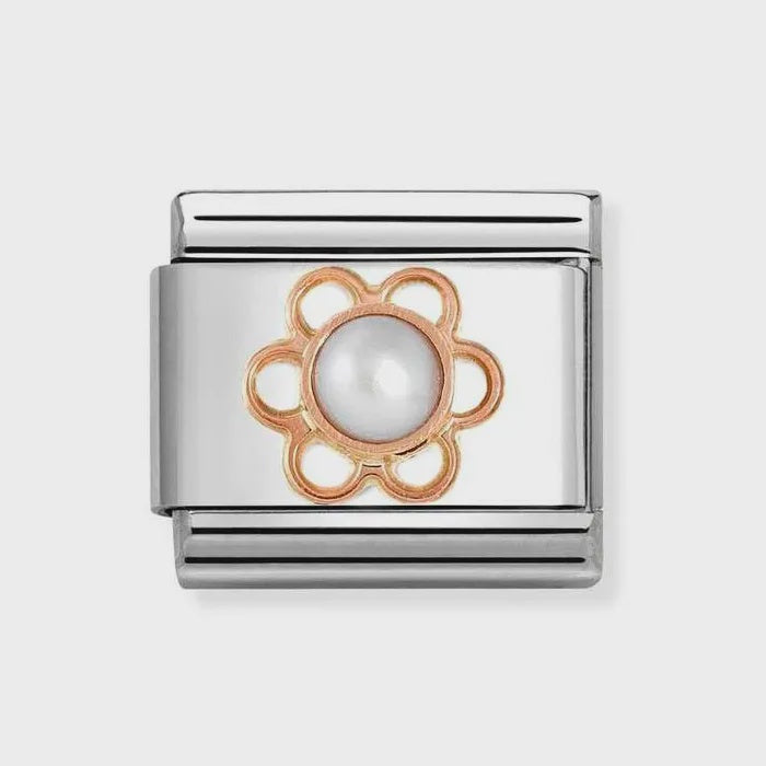 Original Nomination Composable Classic Link for Composable bracelet in stainless steel with bonded rose gold Flower with Freshwater Pearl symbol.This precious Link celebrates family bonds. An elegant flower with the purity of the White Freshwater Pearl come together in a unique and delicate jewel, perfect for esteemed and beloved relatives, like Mom or your Granny. Add this touch of natural beauty to your Composable bracelet to make it more luminous than ever.
