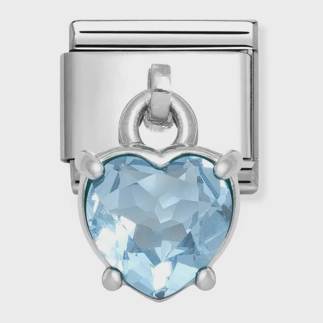Original Nomination Classic Link in stainless steel and sterling silver with Heart Cut Light Blue Cubic Zirconia pendant. The coloured Cubic Zirconia used in this item may be subject to very slight variations in colour. Made in Italy. Choose this sparkling Link to celebrate the arrival of a new little one.