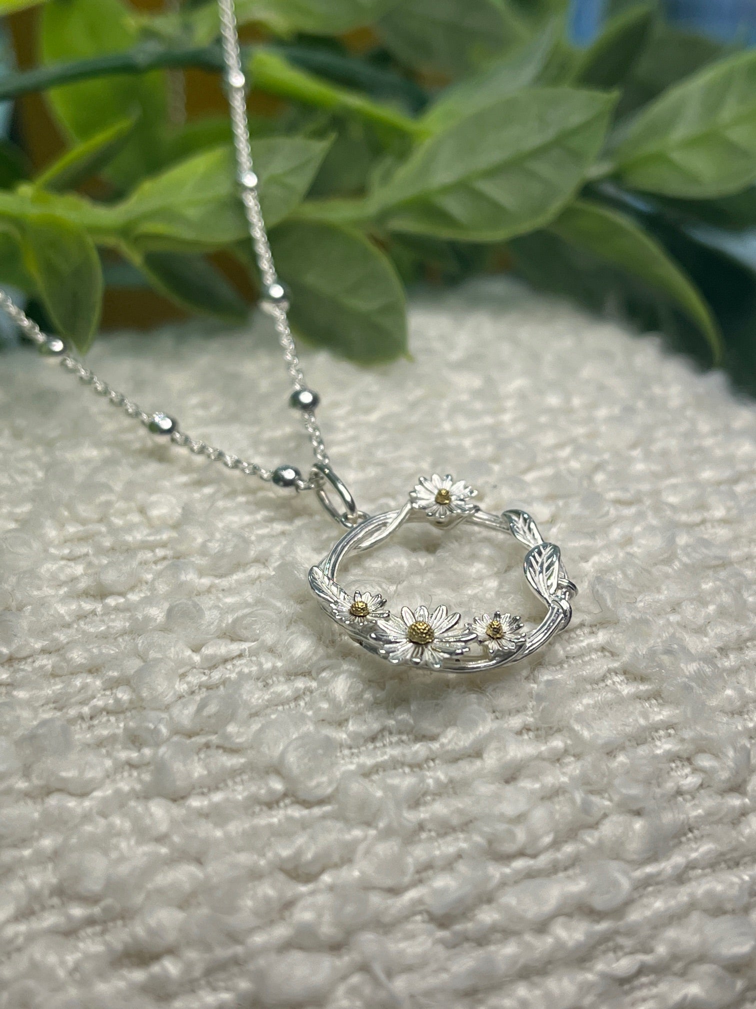 Daisy wrapped vine open circle necklace on beaded chain