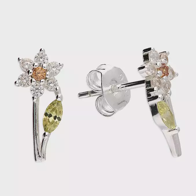 Detailed Green, Yellow and White Cubic Zirconia Flower Studs