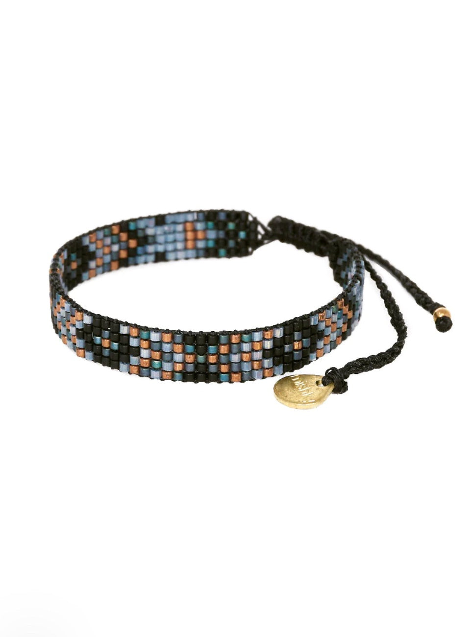 Japanese beads, polyester thread, terlenka thread, bronze gold plated Mishky logo