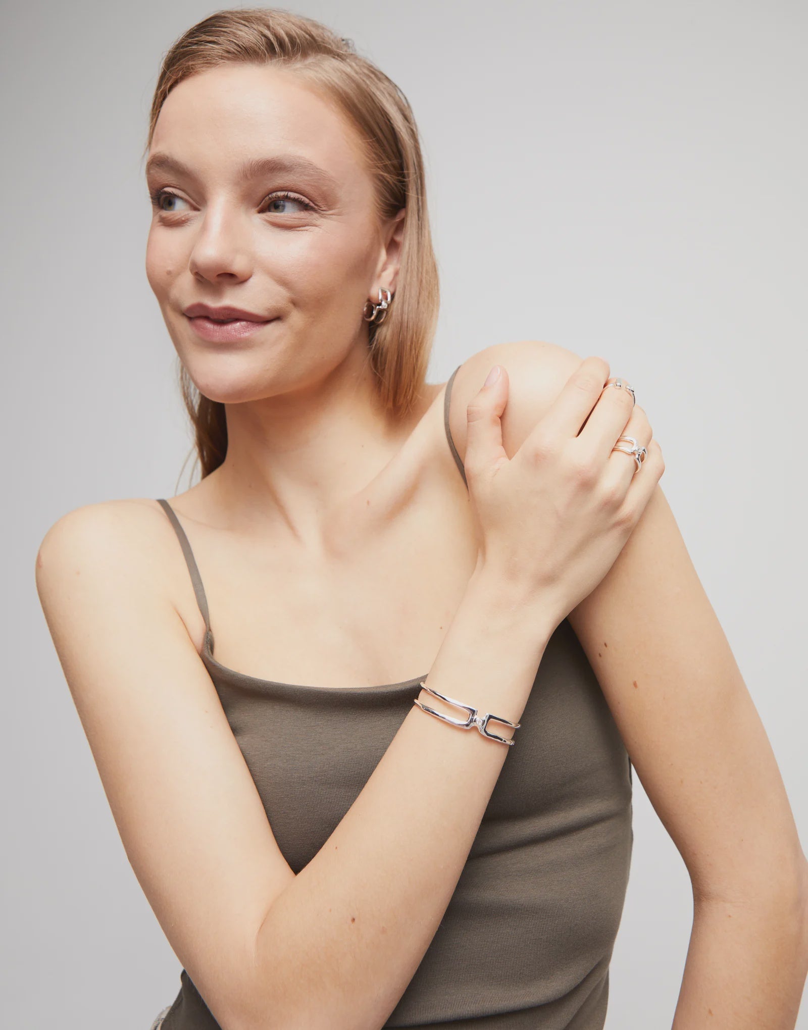 Rigid double sterling silver-plated bracelet with white central topaz. Made in Spain with a 100% handmade process.A collection in which topaz, clean lines and geometric shapes become protagonists, without filters. A collection ready to wear at any time or situation. Discover the collection ser indomable.