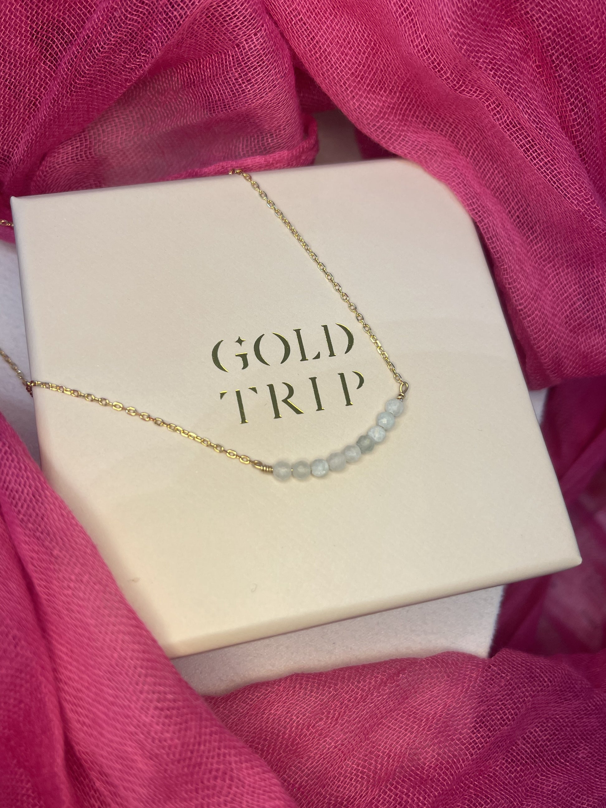 The green aventurine stones are faceted for extra sparkle and carefully hand-strung onto a fine link chain. The overall necklace length is adjustable via an extension chain and the chain is fastened via a lobster clasp. Gold Trip logo engraved disc and hallmark feature at the end.