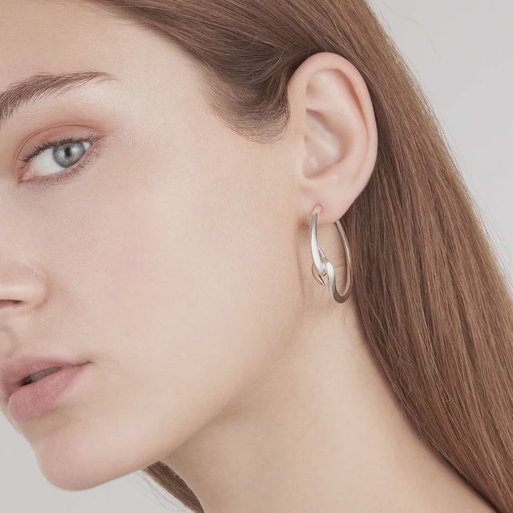 Hook Hoop Earrings are handcrafted from sterling silver, with a discreet diameter of 31mm in length. A cool alternative to classic silver hooped earrings, two sterling silver signature Hooks swept together in a clinch form an open-back rounded silhouette, securely fastened with a butterfly. In smaller sizes, our Hook Hoops are subtle enough for everyday wear, with the refined details made suitable for more pronounced occasions. Techniques such as the knife-edge, carving facets on the jewel’s surface that refract light, sharpening the silhouette. Each Hoop is perfected meticulously through 360 degrees, tactile with ridges delicate enough to run your finger over. Inspiration comes from our House code, Line, taking clean, contemporary classics and elevating them.