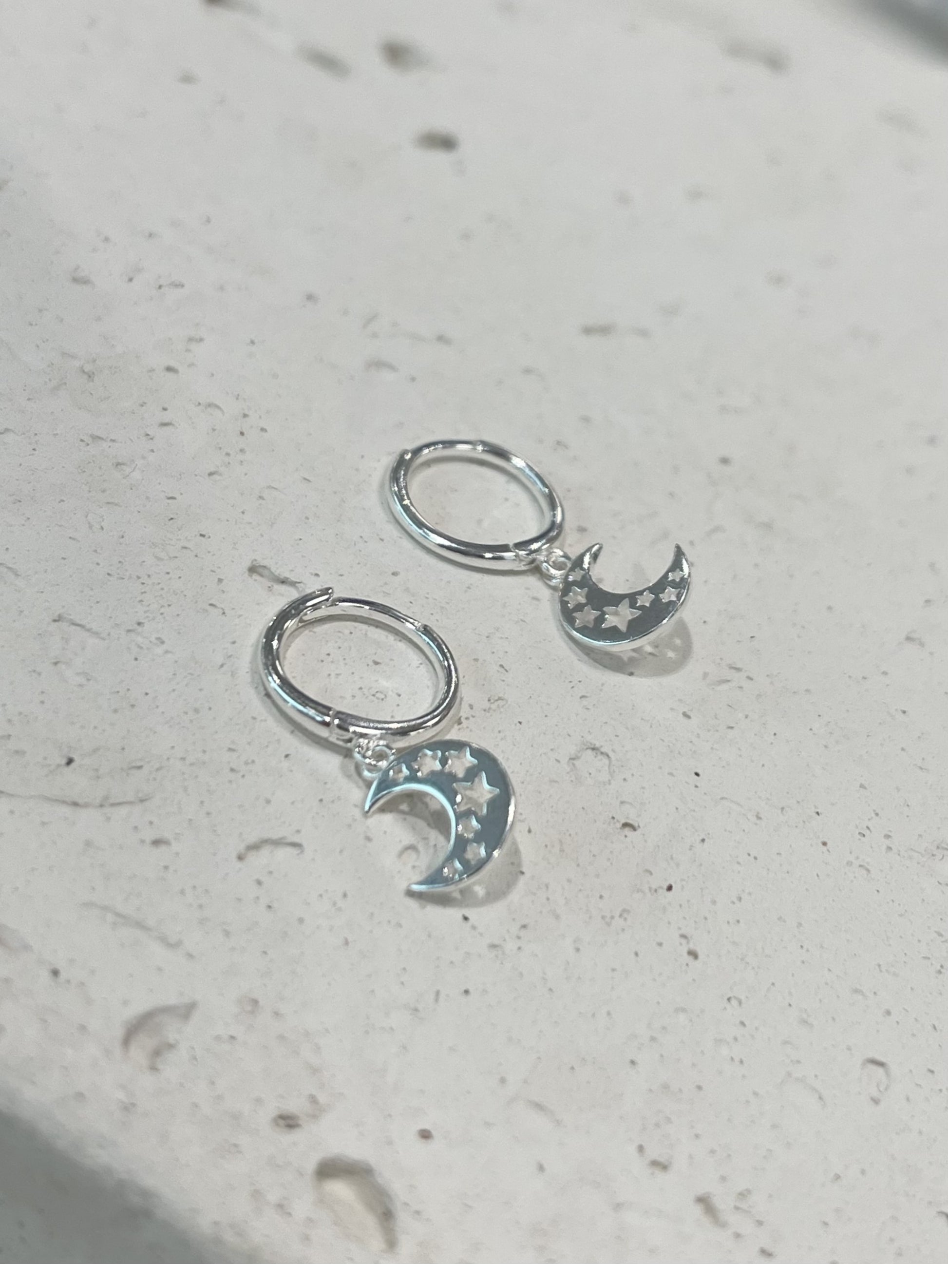 These charming sterling silver huggie hoop earrings feature crescent moon charms with star cut-outs. Lightweight at 1.4g, they offer both comfort and elegance, making them a perfect addition to any jewellery range. Ideal for everyday wear.