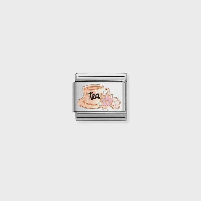 Original Nomination Classic Link in stainless steel with TEA Cup symbol in bonded rose gold with flowers with details in Black, Pink and White enamel.