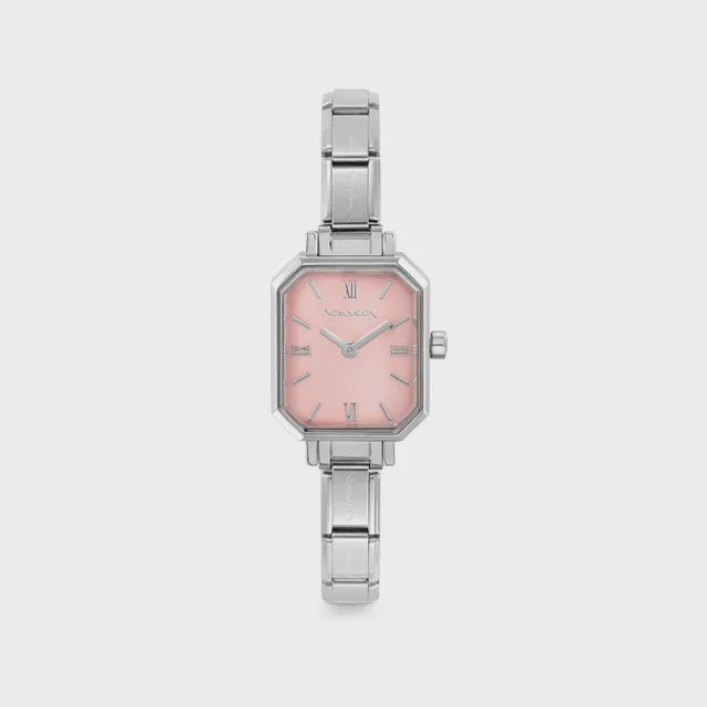 Stainless steel watch from the Time Collection with rectangular brass dial with Pastel Pink finish is pretty and easy-to-read at any time. Waterproof: 3 bars, which means you can face every day in style knowing your watch can take it. You can personalise the watchband bracelet strap with original Composable Classic Decorated Links. Choose this elegant time piece, add Composable Links to celebrate a milestone in someone’s life in a way that they will treasure forever. Other information: Case size: 2.2 x 2.5 cm. Bracelet strap width: 0.8 cm. Presented in official Nomination packaging.