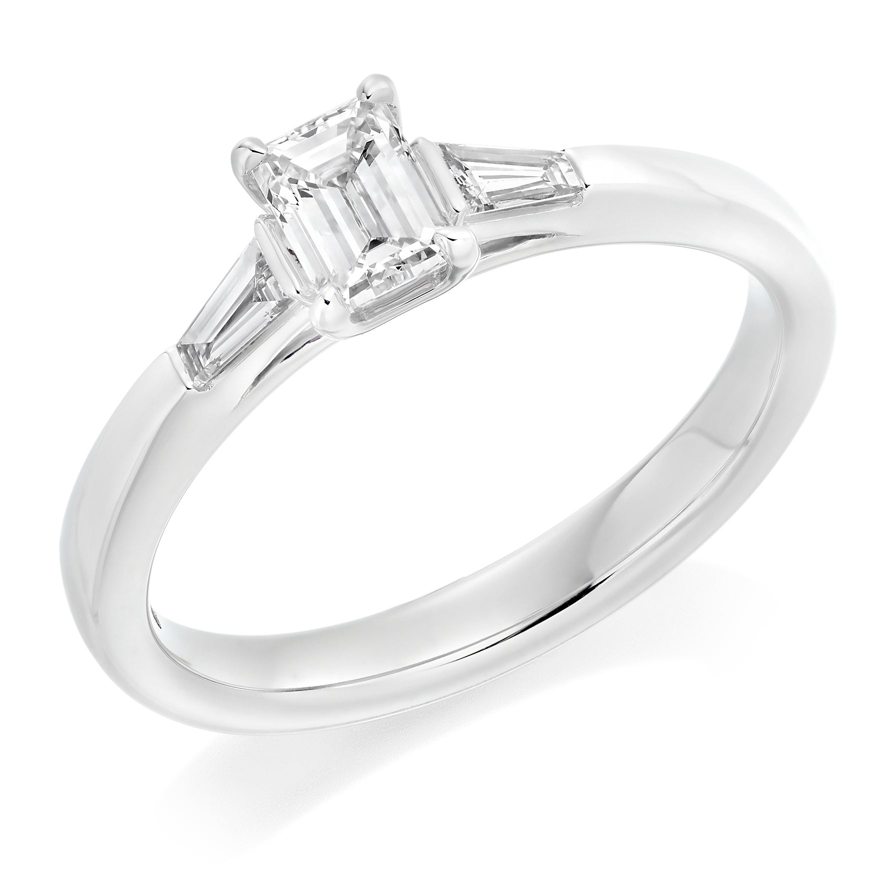 The centre stone is Emerald cut 0.40ct, D in colour. SI1 and comes with a GIA Certificate. Set in Platinum with the baguette diamonds set either side of the central stone 0.17ct. Total diamond weight is over half a carat 0.57ct