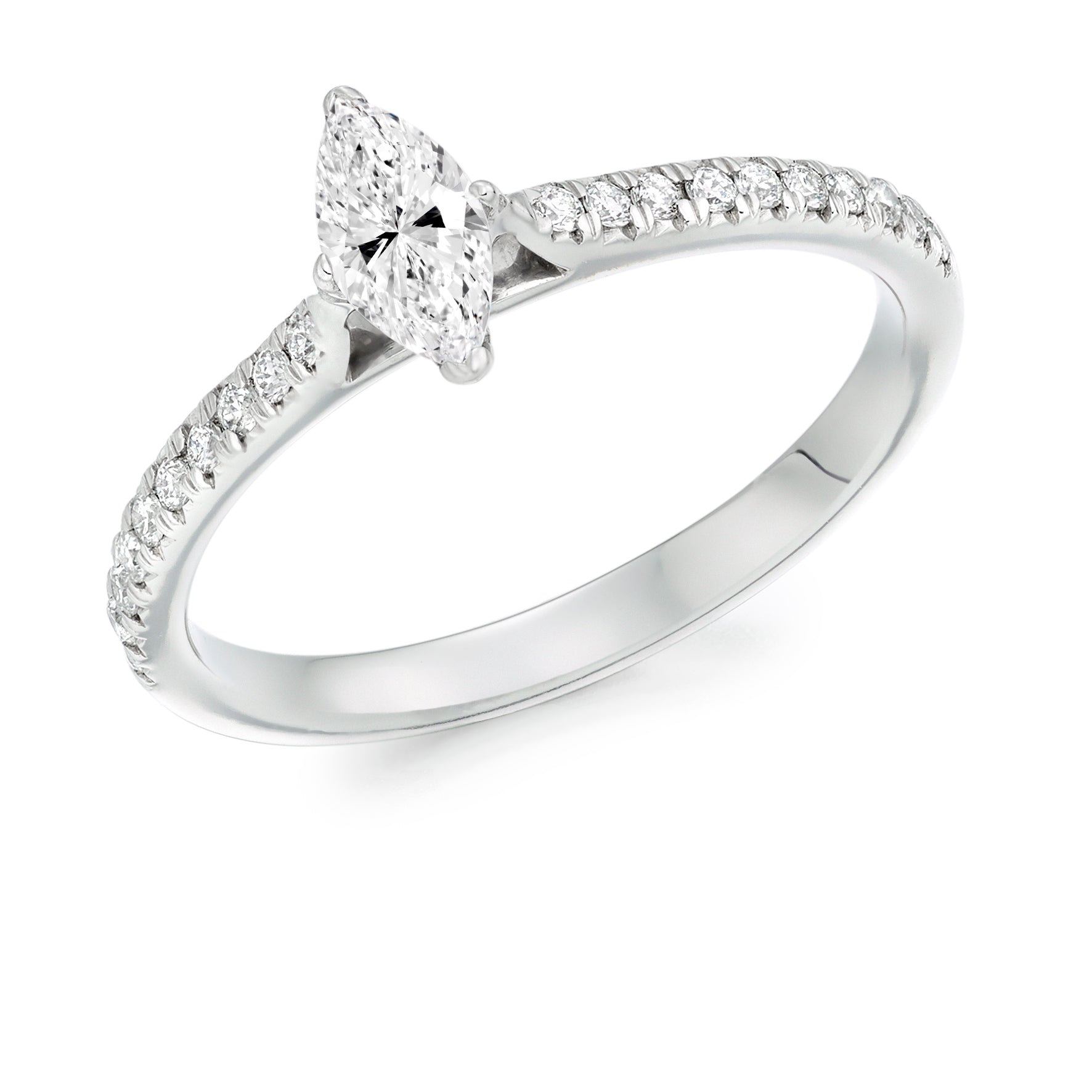 This exquisite ring is set with a 0.30ct central Marquise shaped diamond. E in colour, SI1 clarity. The shoulders of the ring are set with 0.20ct of round brilliant diamonds.