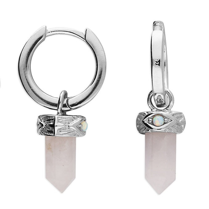 Rose quartz hexagonal charm on hinged huggie-hoop