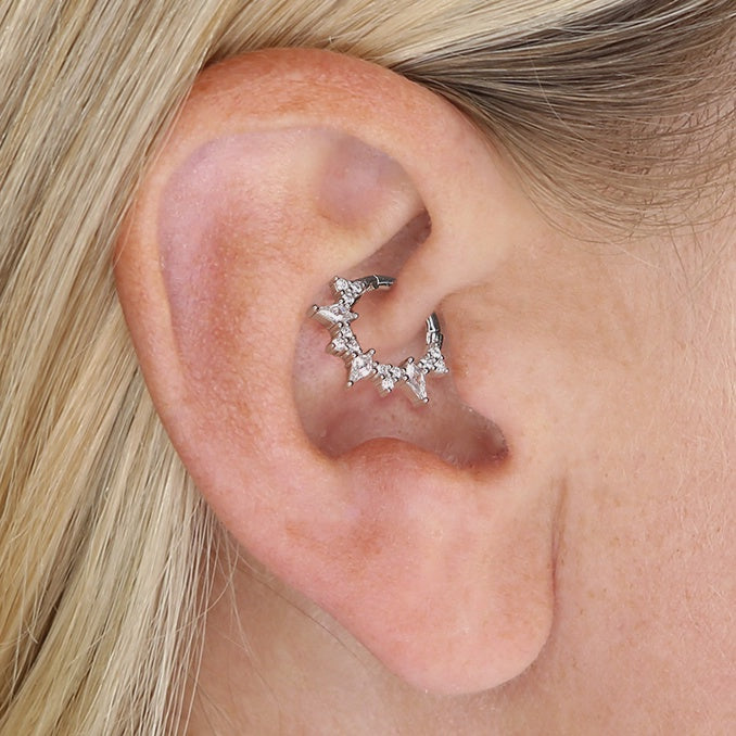 Single rhodium plated sun ray cubic zirconia daith hoop