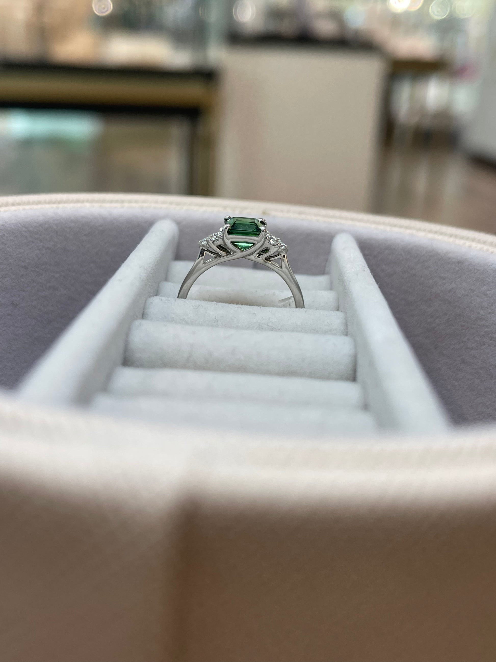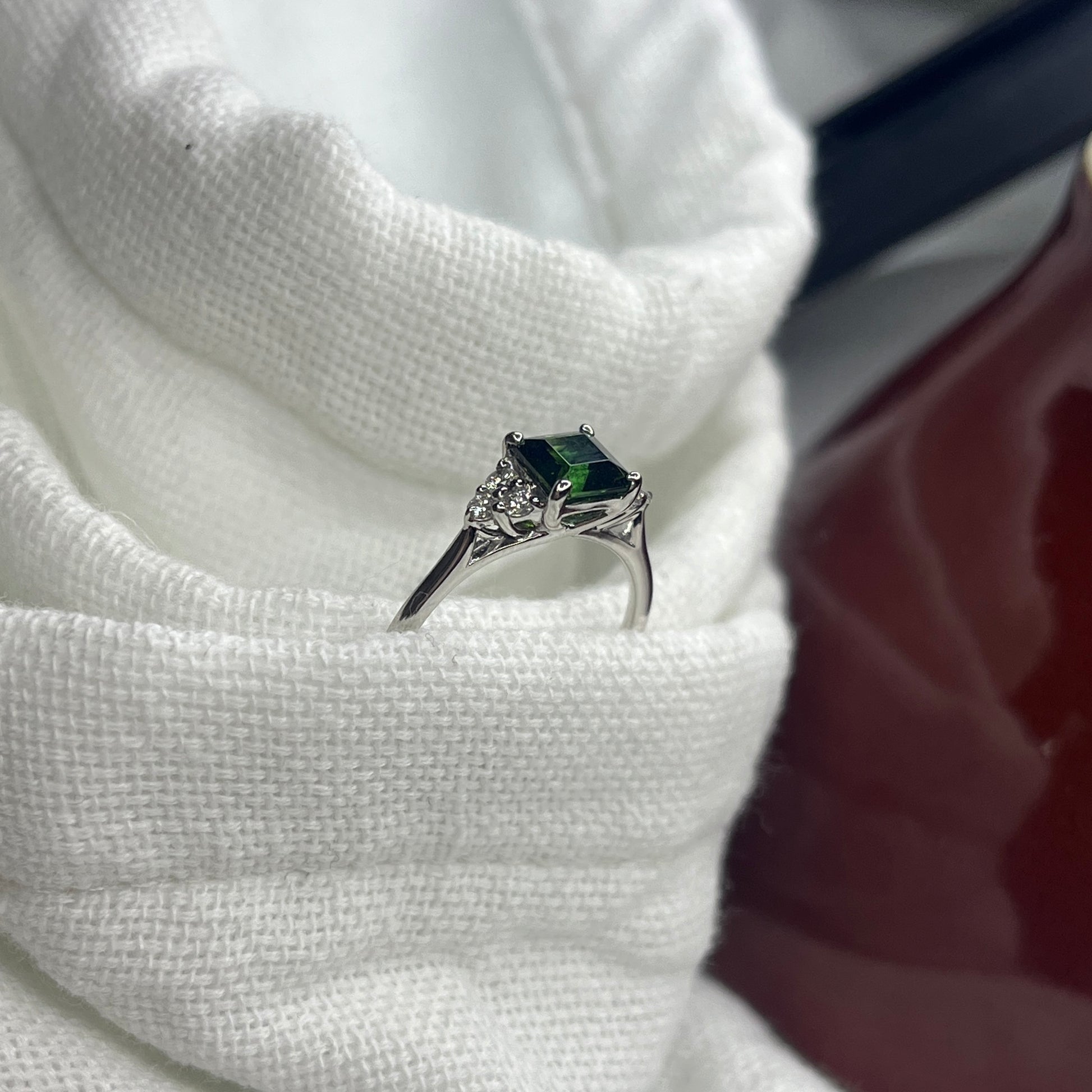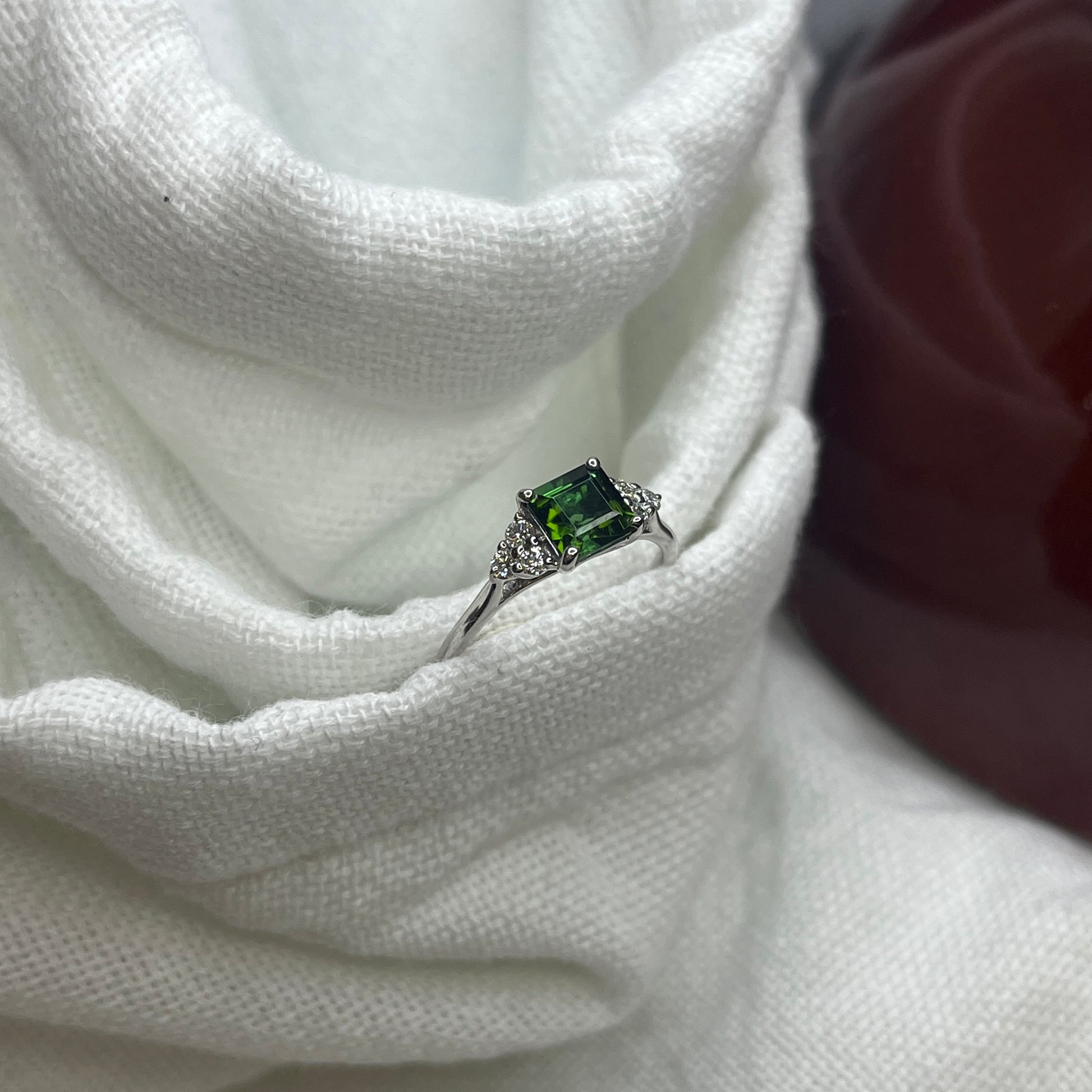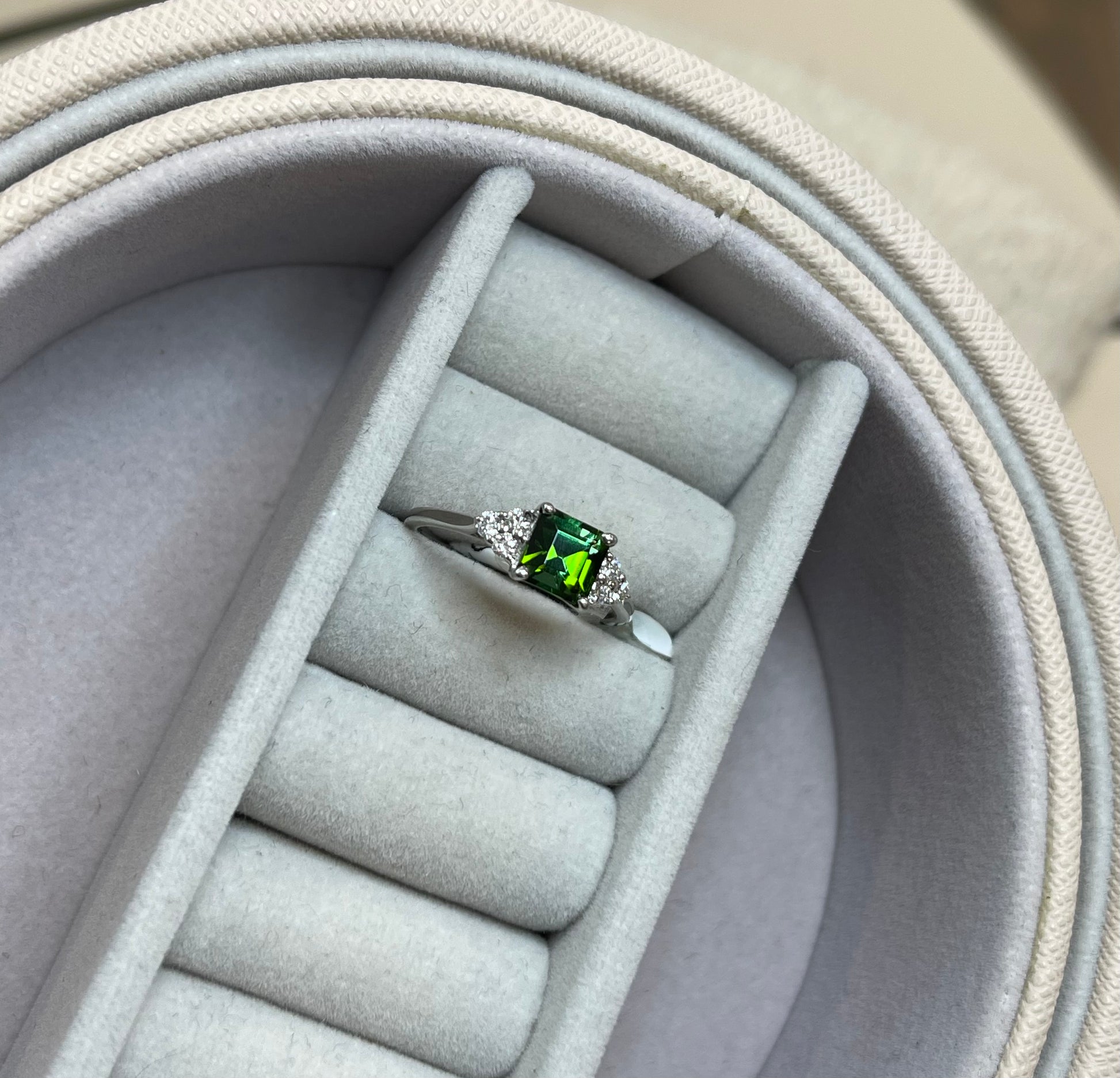 Green tourmaline ring with trefoil diamond setting on shoulders Size M