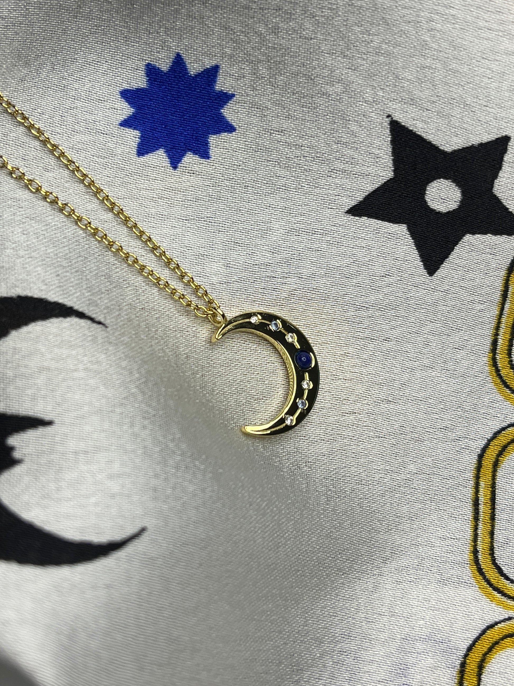 42-45cm Yellow gold plated lapis and cubic zirconia moon on chain.