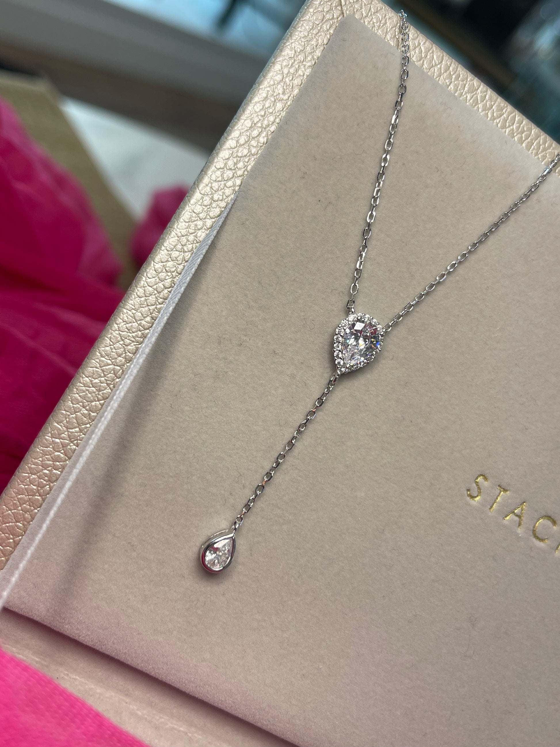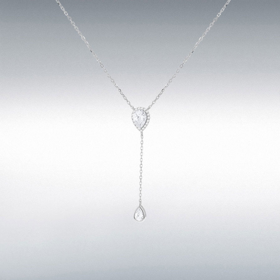 Sterling Silver Rhodium Plated White CZ Teardrop Adjustable Lariat Necklace 38cm/15"-43cm/17"