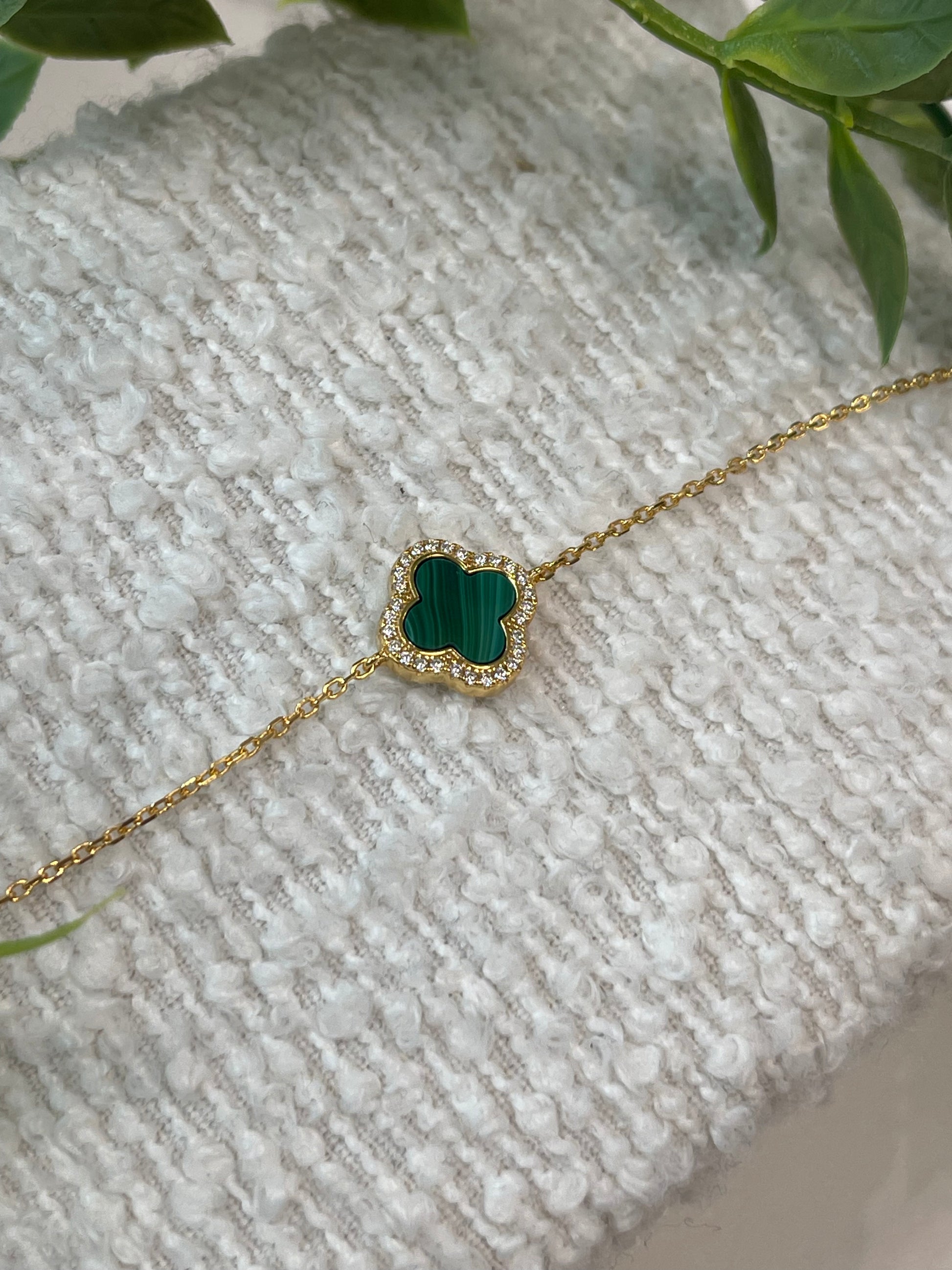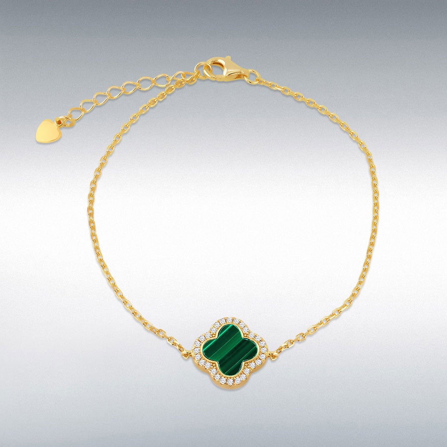 Gold Plated Clover Malachite and White CZ Adjustable Bracelet